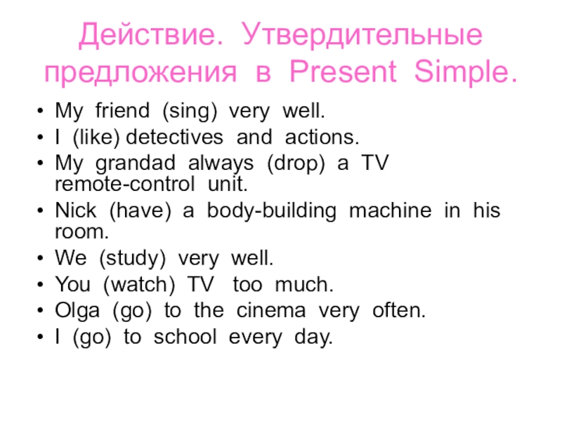 Действие. Утвердительные предложения в Present Simple.My friend (sing) very well.I (like) detectives and actions.My grandad always (drop)