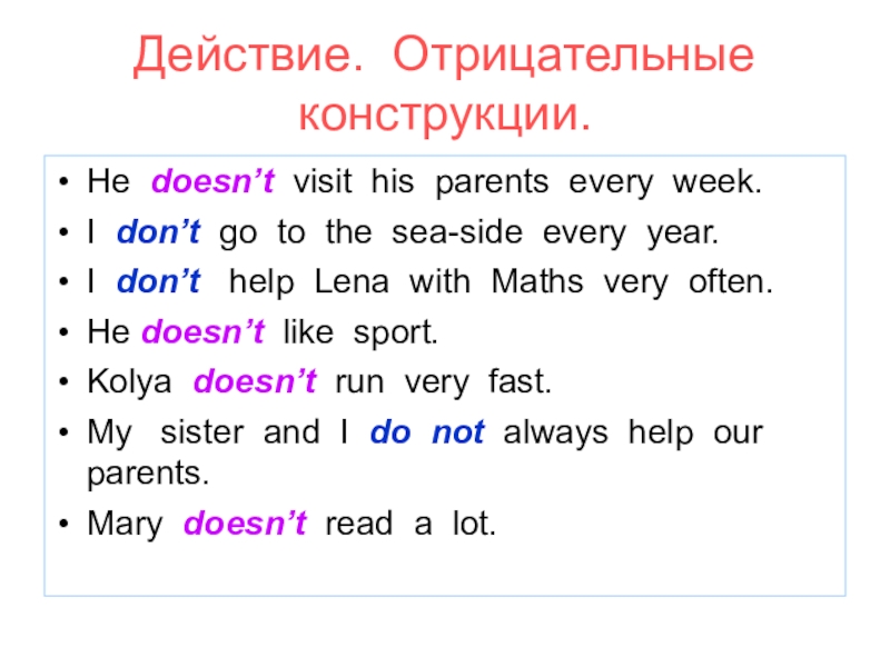 Действие. Отрицательные конструкции.He doesn’t visit his parents every week.I don’t go to the sea-side every year.I don’t