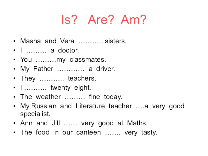 Is?  Are? Am?Masha and Vera ……….. sisters.I ……… a doctor.You ………my classmates.My Father ………… a driver.They
