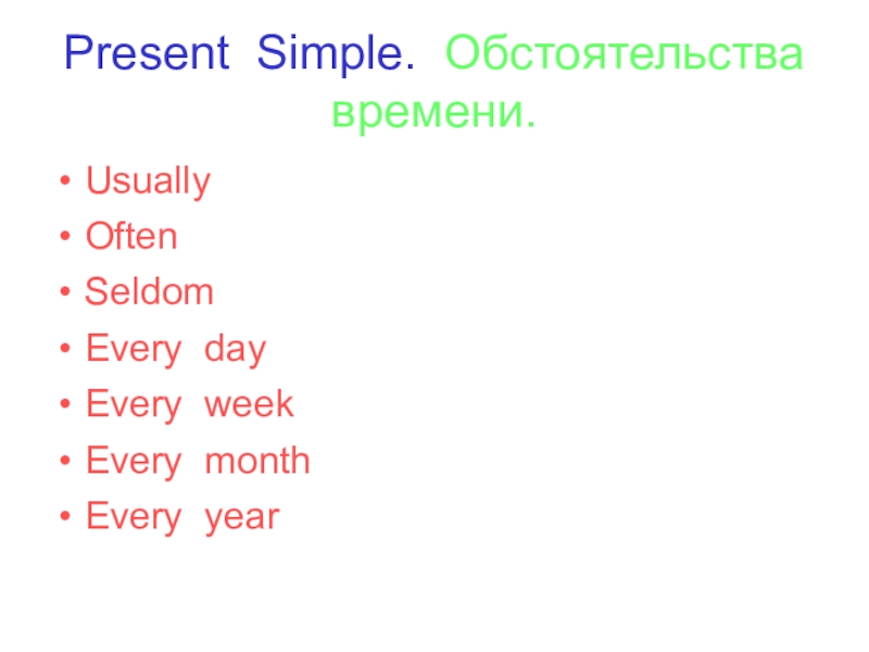Present Simple. Обстоятельства времени.UsuallyOftenSeldomEvery dayEvery weekEvery monthEvery year