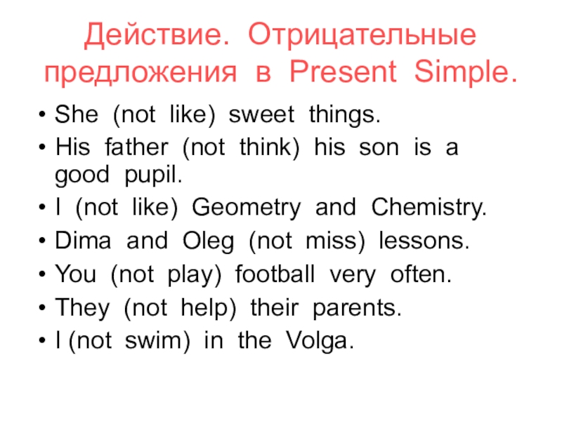 Действие. Отрицательные предложения в Present Simple.She (not like) sweet things.His father (not think) his son is a