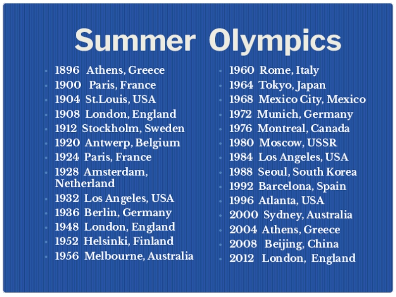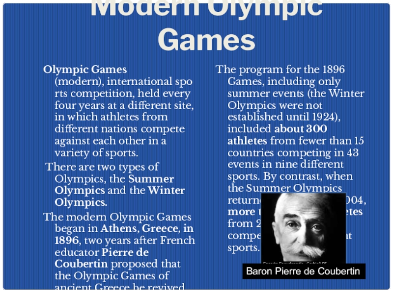 The program for the 1896 Games, including only summer events (the Winter Olympics were not established until 1924), included about 300 athletes from fewer than 15 countries competing in 43 events in nine different sports. By contrast, when the Summer Olympics returned to Athens in 2004, more than 10,000 athletes from 202 countries competed in 28 different sports.