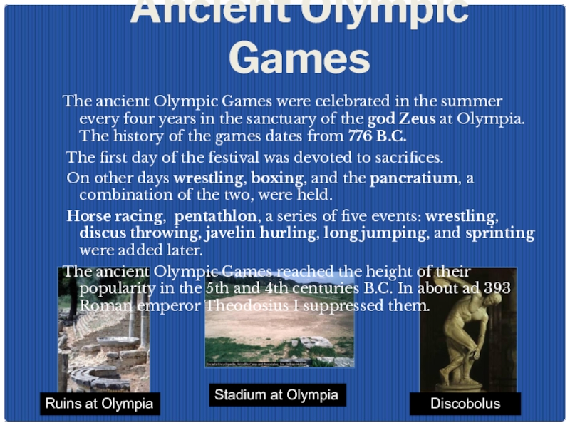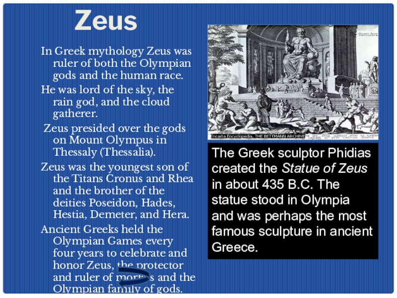 The Greek sculptor Phidias created the Statue of Zeus in about 435 B.C. The statue stood in Olympia and was perhaps the most famous sculpture in ancient Greece.