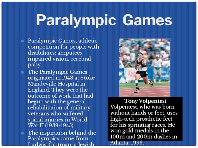 Volpentest, who was born without hands or feet, uses high-tech prosthetic feet for his sprinting races. He won gold medals in the 100m and 200m dashes in Atlanta, 1996.
