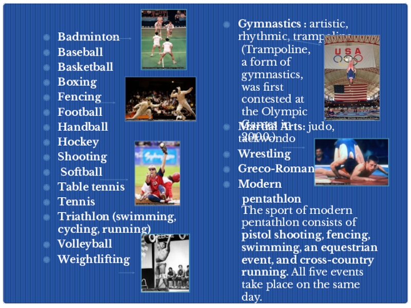 (Trampoline, a form of gymnastics, was first contested at the Olympic Games in 2000.)