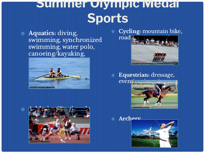 The sport of modern pentathlon consists of pistol shooting, fencing, swimming, an equestrian event, and cross-country running. All five events take place on the same day.