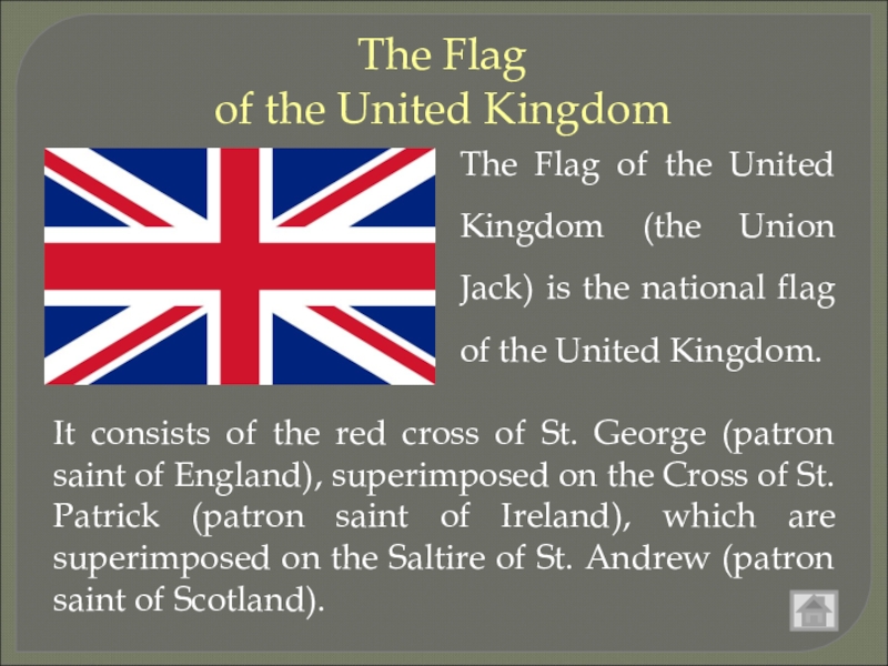 It consists of the red cross of St. George (patron saint of England), superimposed on the Cross of St. Patrick (patron saint of Ireland), which are superimposed on the Saltire of St. Andrew (patron saint of Scotland).