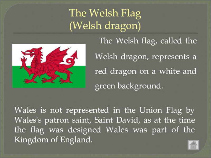 Wales is not represented in the Union Flag by Wales's patron saint, Saint David, as at the time the flag was designed Wales was part of the Kingdom of England.