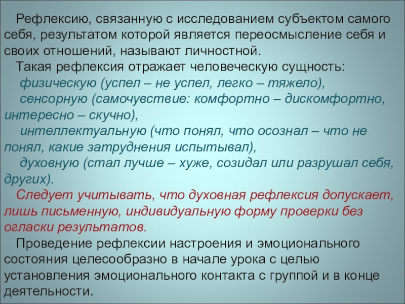 Слайд 8Рефлексию, связанную с исследованием субъектом самого себя, результатом которой является переосмысление