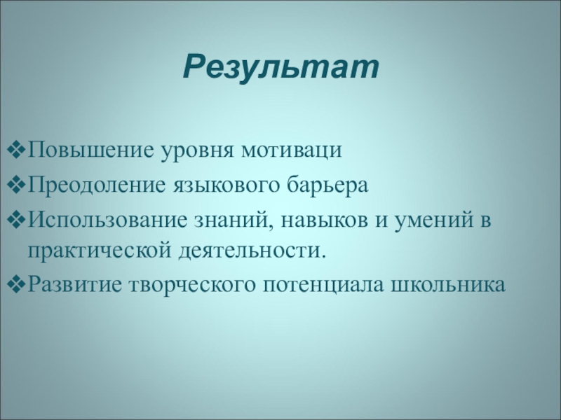 РезультатПовышение уровня мотивациПреодоление языкового барьераИспользование знаний, навыков и умений в  практической деятельности.Развитие творческого потенциала школьника