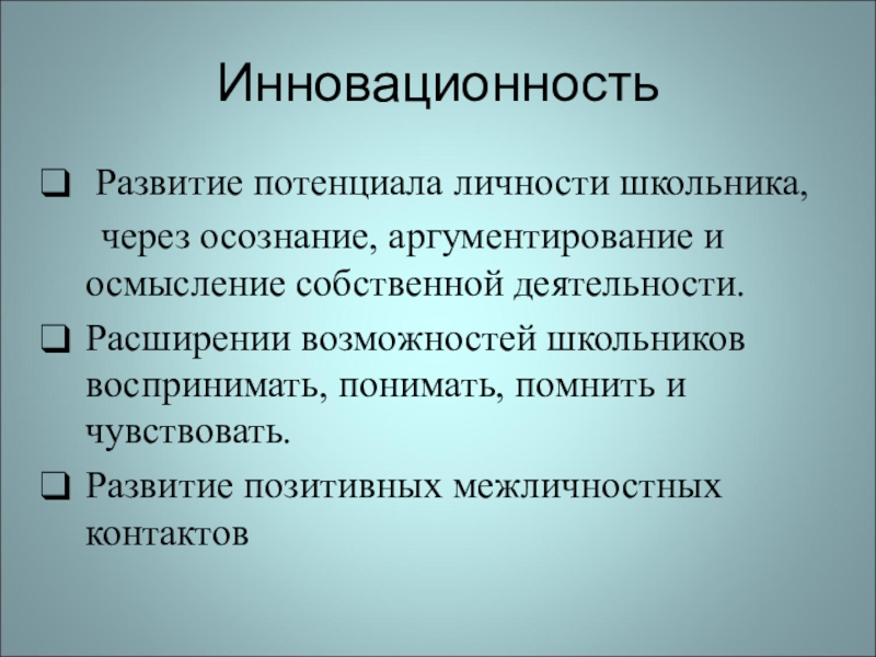Инновационность Развитие потенциала личности школьника, через осознание, аргументирование и осмысление собственной деятельности.Расширении возможностей школьников воспринимать, понимать, помнить и чувствовать.Развитие позитивных межличностных контактов