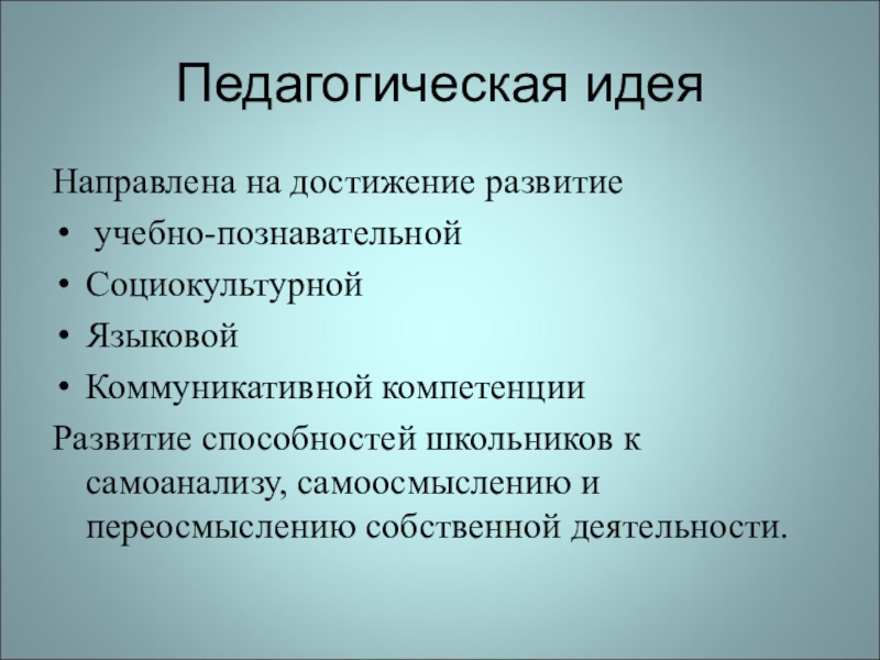 Педагогическая идеяНаправлена на достижение развитие учебно-познавательнойСоциокультурнойЯзыковойКоммуникативной компетенцииРазвитие способностей школьников к самоанализу, самоосмыслению и переосмыслению собственной деятельности.