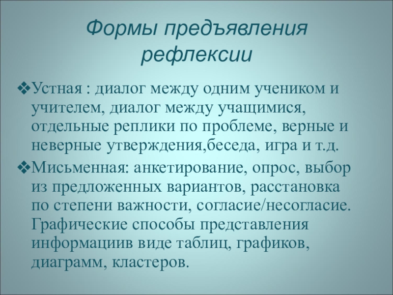 Формы предъявления рефлексииУстная : диалог между одним учеником и учителем, диалог между учащимися, отдельные реплики по проблеме,