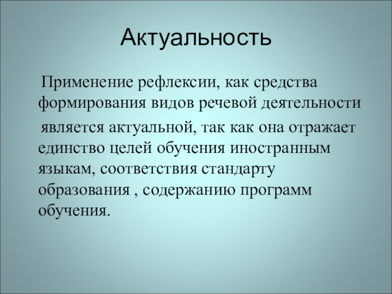 Актуальность  Применение рефлексии, как средства формирования видов речевой деятельности  является актуальной, так как она отражает