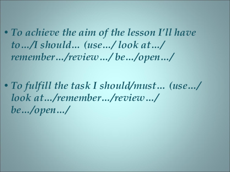 To achieve the aim of the lesson I’ll have to…/I should… (use…/ look at…/ remember…/review…/ be…/open…/To fulfill