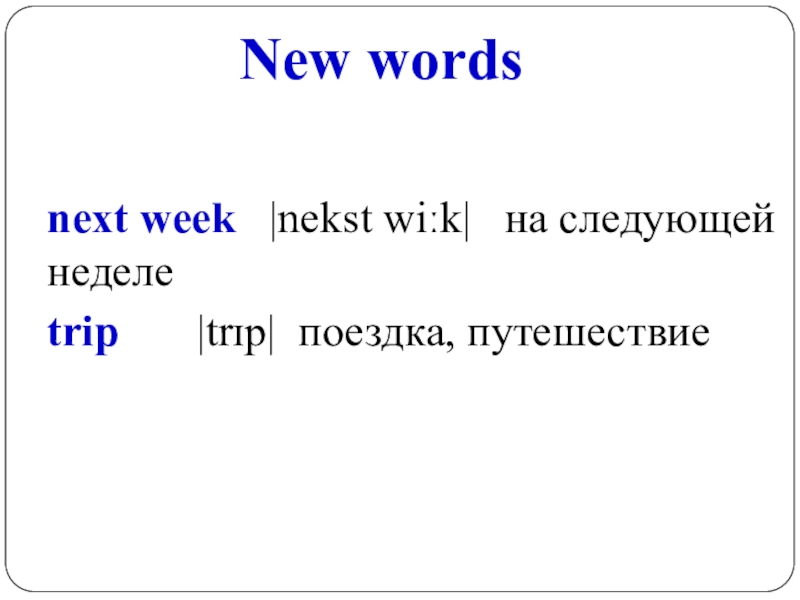 New wordsnext week |nekst wiːk| на следующей неделе trip |trɪp| поездка, путешествие
