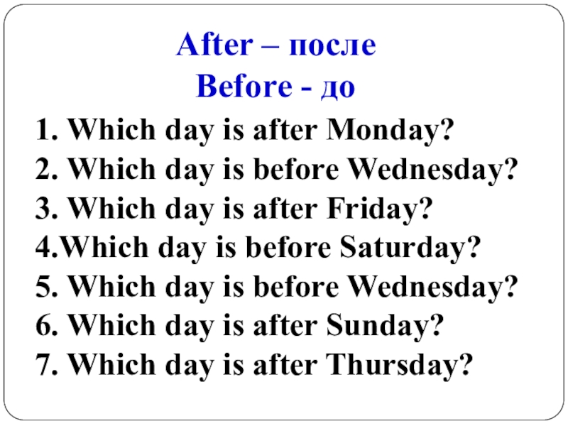 After – после Before - до1. Which day is after Monday?2. Which day is before Wednesday?3. Which