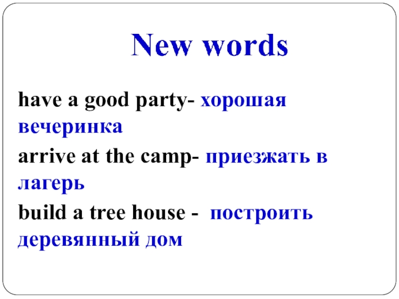 have a good party- хорошая вечеринкаarrive at the camp- приезжать в лагерьbuild a tree house - построить