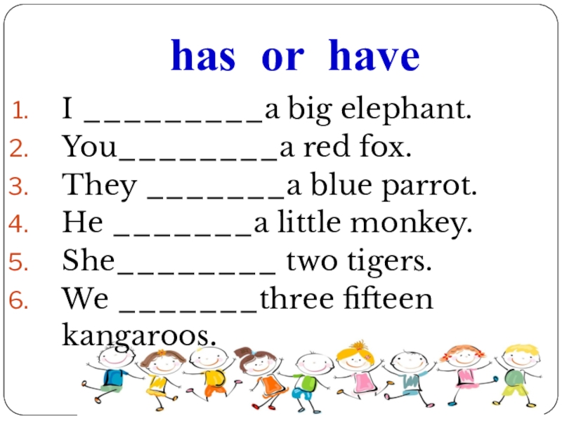 has or haveI _________a big elephant.You________a red fox.They _______a blue parrot.He _______a little monkey.She________ two tigers.We _______three