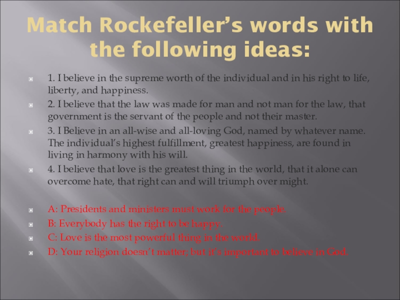 Слайд 14Match Rockefeller’s words with the following ideas: