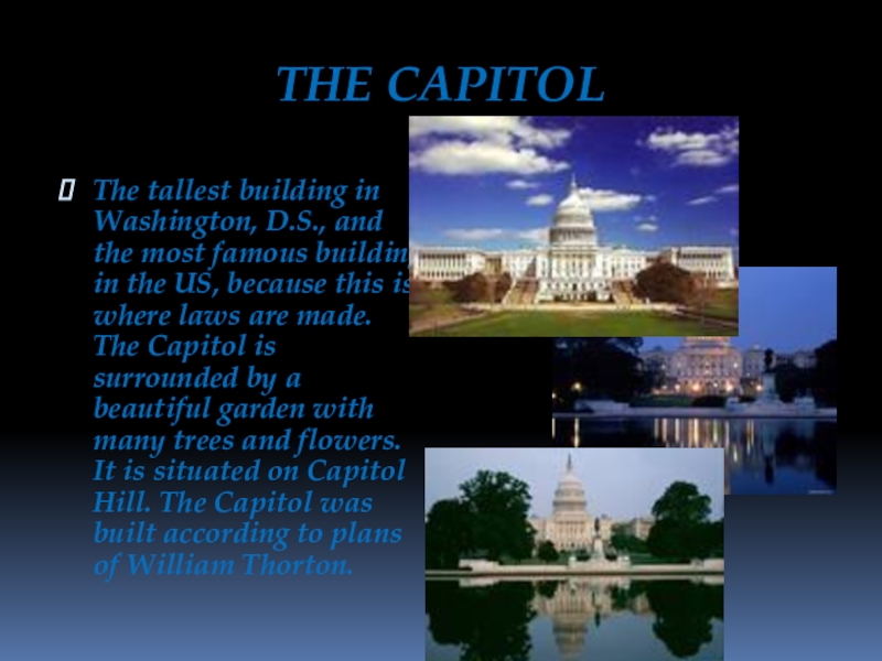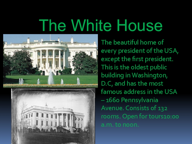 The beautiful home of every president of the USA, except the first president. This is the oldest public building in Washington, D.C, and has the most famous address in the USA – 1660 Pennsylvania Avenue. Consists of 132 rooms. Open for tours10:00 a.m. to noon.