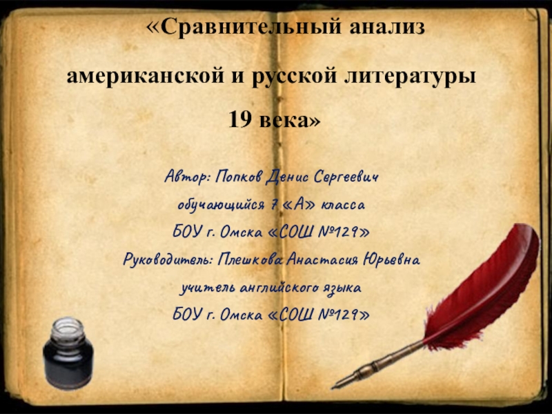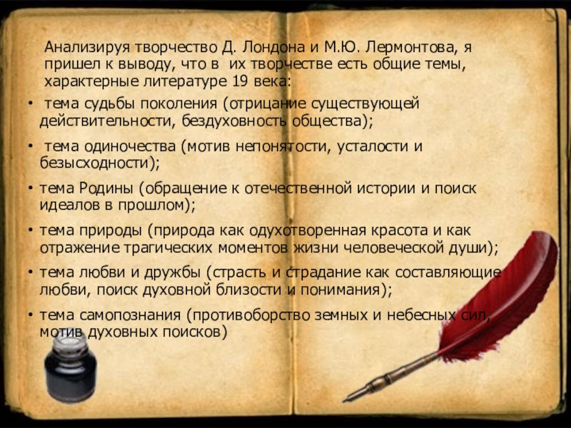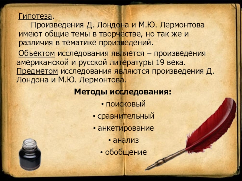 Объектом исследования является – произведения американской и русской литературы 19 века. Предметом исследования являются произведения Д. Лондона и М.Ю. Лермонтова.