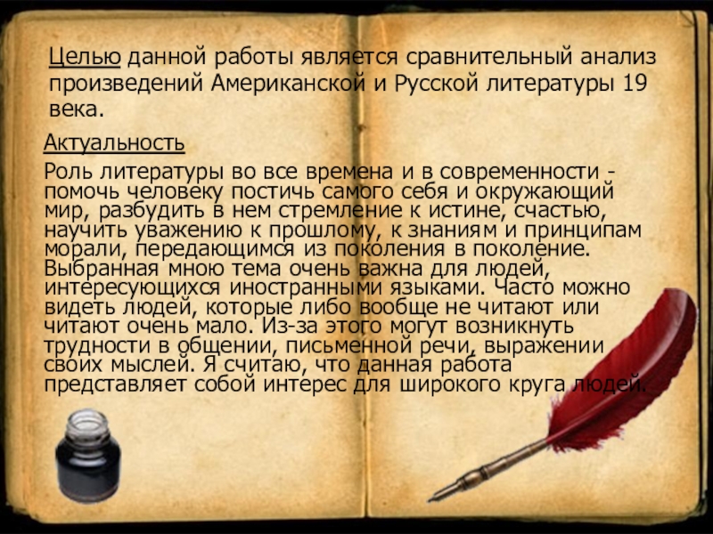 Роль литературы во все времена и в современности - помочь человеку постичь самого себя и окружающий мир, разбудить в нем стремление к истине, счастью, научить уважению к прошлому, к знаниям и принципам морали, передающимся из поколения в поколение. Выбранная мною тема очень важна для людей, интересующихся иностранными языками. Часто можно видеть людей, которые либо вообще не читают или читают очень мало. Из-за этого могут возникнуть трудности в общении, письменной речи, выражении своих мыслей. Я считаю, что данная работа представляет собой интерес для широкого круга людей.