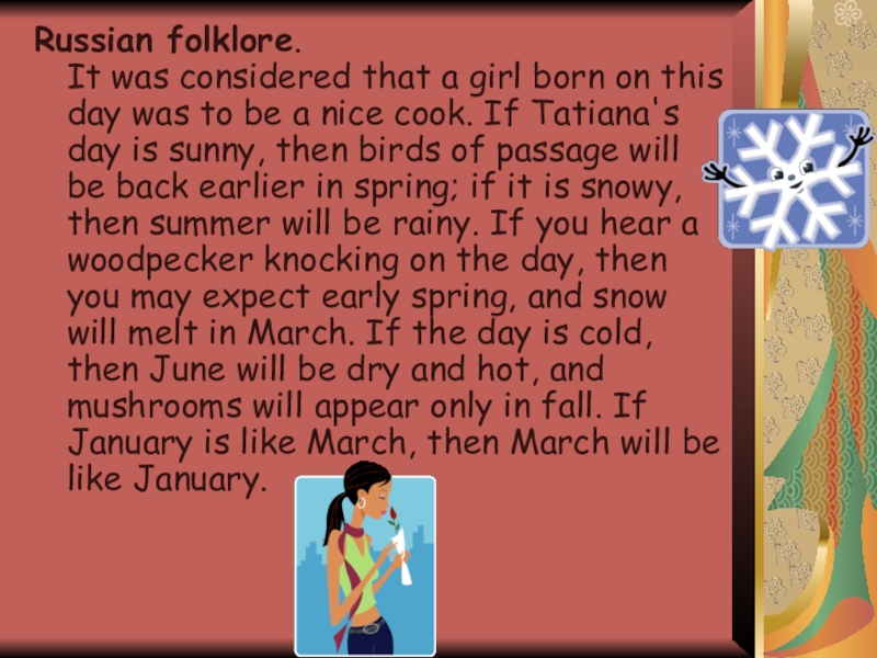 Слайд 4Russian folklore. It was considered that a girl born on this day