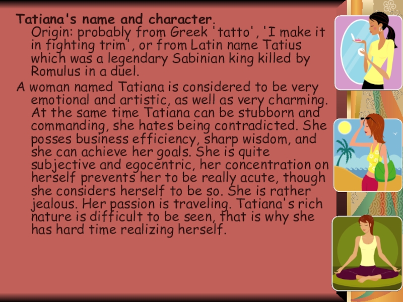 Слайд 5Tatiana's name and character. Origin: probably from Greek 'tatto', 'I make it