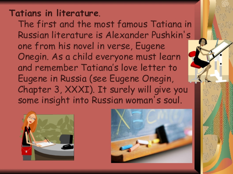 Слайд 6Tatians in literature. The first and the most famous Tatiana in Russian