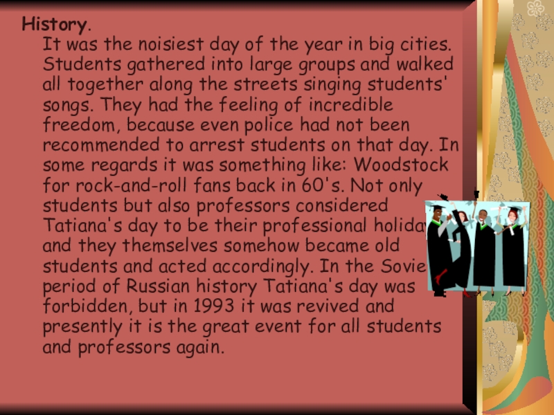Students gathered into large groups and walked all together along the streets singing students' songs. They had the feeling of incredible freedom, because even police had not been recommended to arrest students on that day. In some regards it was something like: Woodstock for rock-and-roll fans back in 60's. Not only students but also professors considered Tatiana's day to be their professional holiday and they themselves somehow became old students and acted accordingly. In the Soviet period of Russian history Tatiana's day was forbidden, but in 1993 it was revived and presently it is the great event for all students and professors again.
