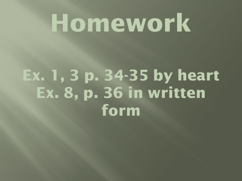 Слайд 9Homework Ex. 1, 3 p. 34-35 by heart Ex. 8, p. 36