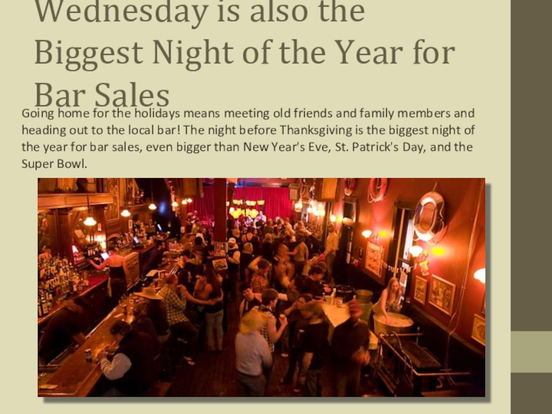 Going home for the holidays means meeting old friends and family members and heading out to the local bar! The night before Thanksgiving is the biggest night of the year for bar sales, even bigger than New Year's Eve, St. Patrick's Day, and the Super Bowl.