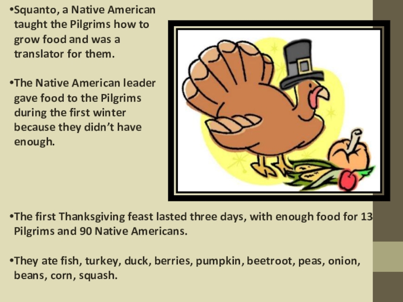 Squanto, a Native American taught the Pilgrims how to grow food and was a translator for them.