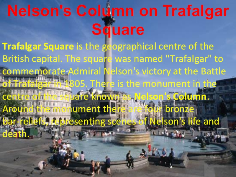 the British capital. The square was named "Trafalgar" to commemorate Admiral Nelson's victory at the Battle of Trafalgar in 1805. There is the monument in the centre of the square known as Nelson's Column. Around the monument there are four bronze bar-reliefs, representing scenes of Nelson's life and death.