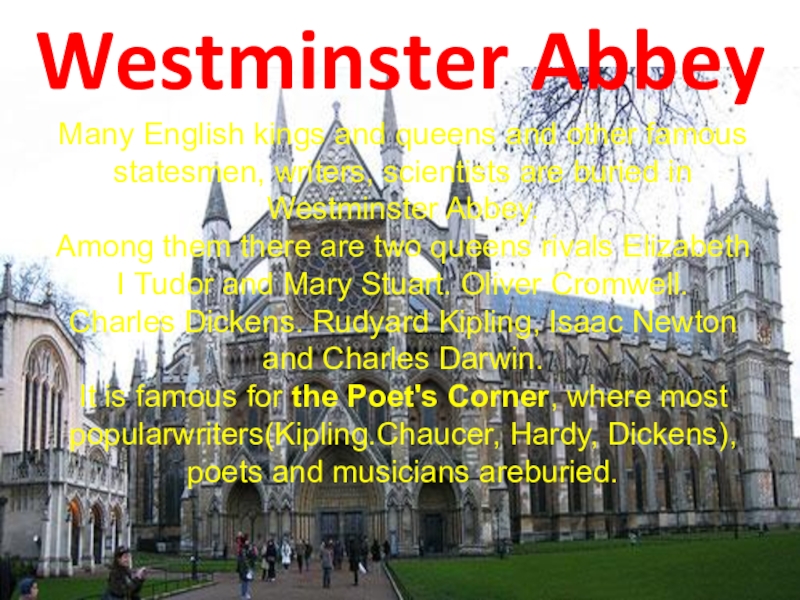 It is famous for the Poet's Corner, where most popularwriters(Kipling.Chaucer, Hardy, Dickens), poets and musicians areburied.