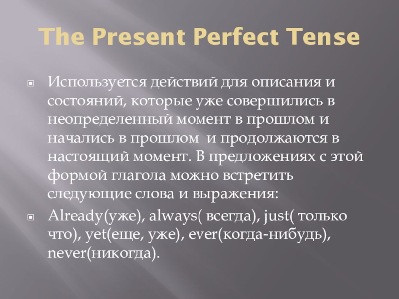 The Present Perfect TenseИспользуется действий для описания и состояний, которые уже совершились в неопределенный момент в прошлом