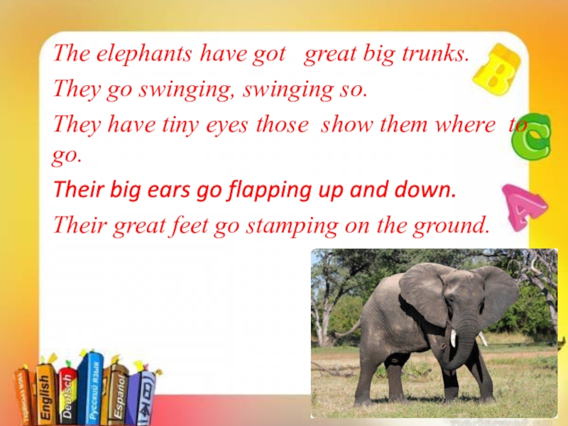 The elephants have got  great big trunks.They go swinging, swinging so.They have tiny eyes those show