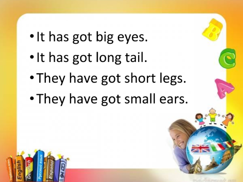 It has got big eyes.It has got long tail.They have got short legs.They have got small ears.