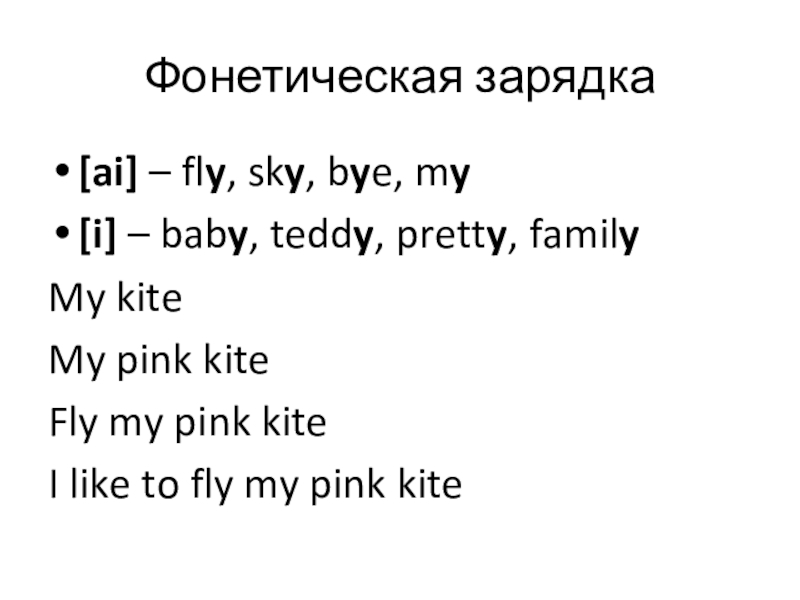 Фонетическая зарядка[ai] – fly, sky, bye, my[i] – baby, teddy, pretty, familyMy kiteMy pink kiteFly my pink kiteI like to fly my pink kite