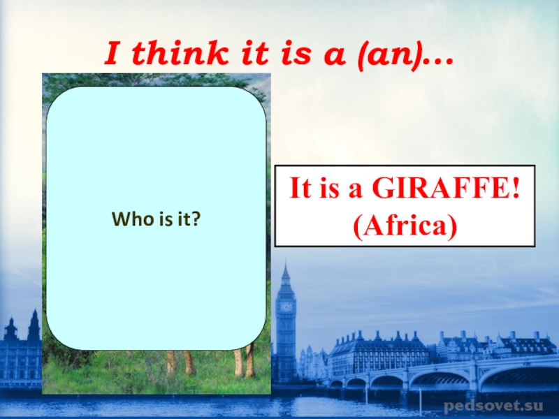I think it is a (an)...Who is it?It is a GIRAFFE!(Africa)