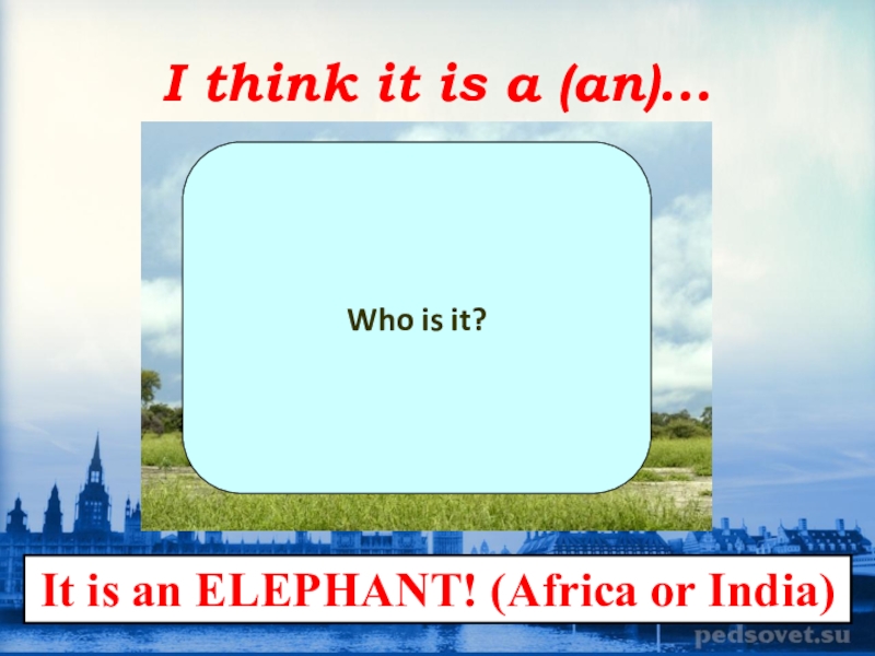 I think it is a (an)...Who is it?It is an ELEPHANT! (Africa or India)