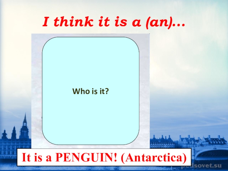 I think it is a (an)...It is a PENGUIN! (Antarctica)Who is it?