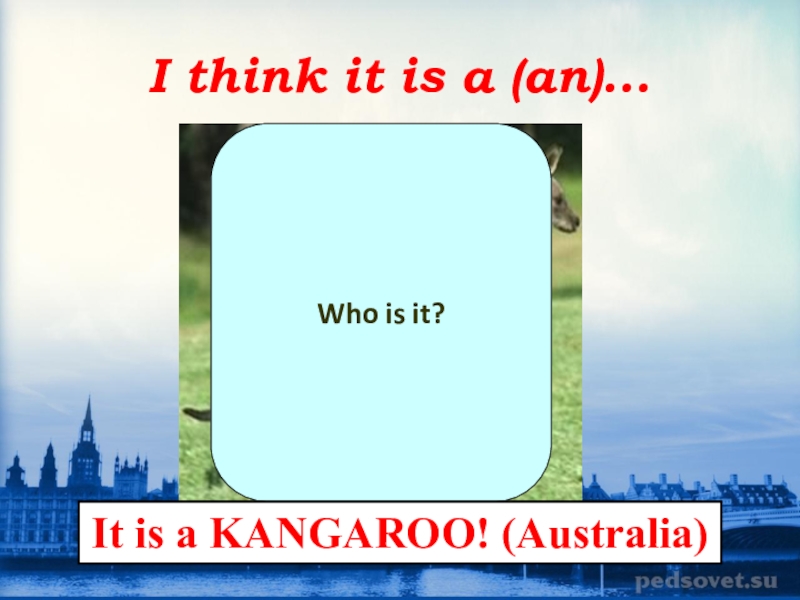 I think it is a (an)...Who is it?It is a KANGAROO! (Australia)