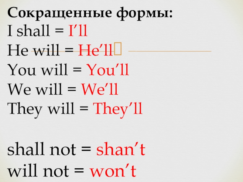 Сокращенные формы: I shall = I’ll He will = He’ll You will = You’ll We will =