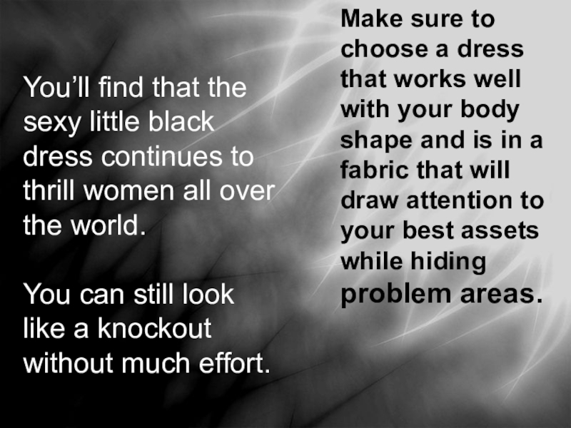 Make sure to choose a dress that works well with your body shape and is in a fabric that will draw attention to your best assets while hiding problem areas.