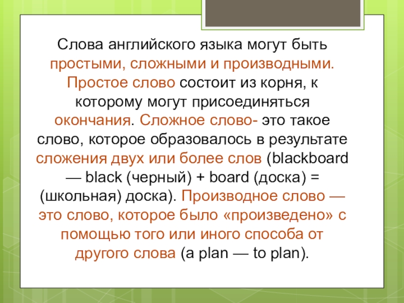 состоит из корня, к которому могут присоединяться окончания. Сложное слово- это такое слово, которое образовалось в результате сложения двух или более слов (blackboard — black (черный) + board (доска) = (школьная) доска). Производное слово — это слово, которое было «произведено» с помощью того или иного способа от другого слова (a plan — to plan).