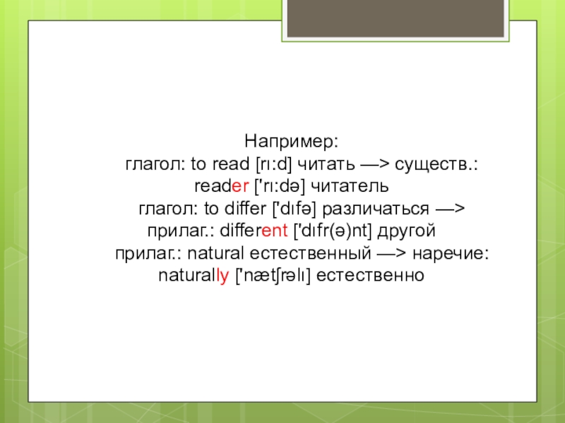 глагол: to read [rı:d] читать —> существ.: reader ['rı:də]