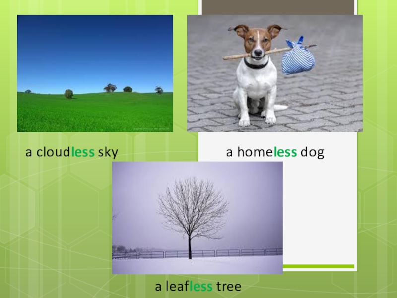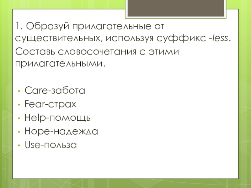 Слайд 171. Образуй прилагательные от существительных, используя суффикс -less.