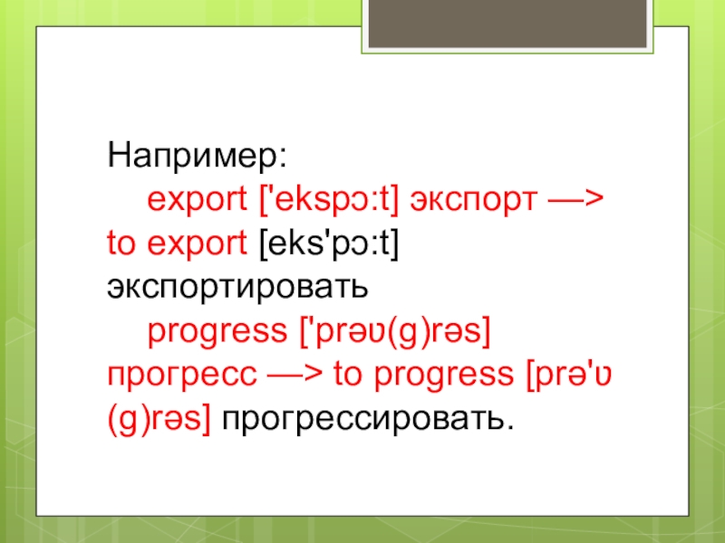 export ['ekspɔ:t] экспорт —> to export [eks'pɔ:t] экспортировать